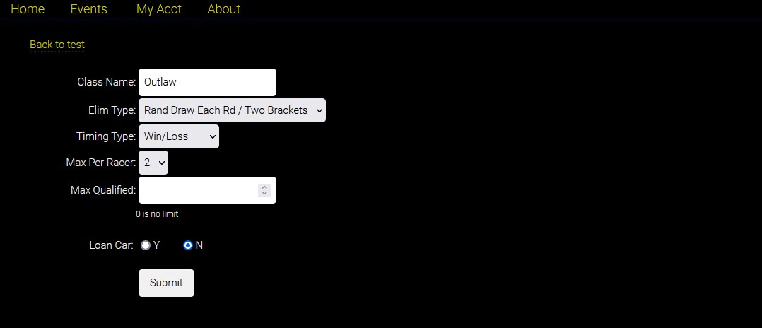 All Fields are optional except the Start Date, and Event Name. Race Fee is the same as Track Fee, then Class Fee is amount added per class.